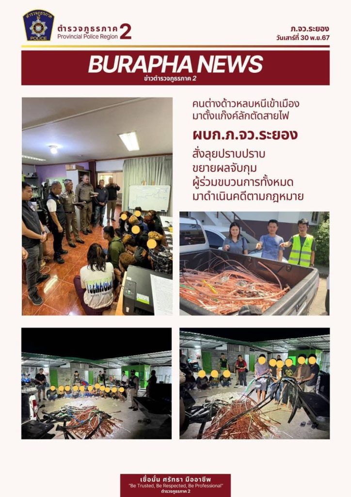 โดยเมื่อวันที่ 29 พ.ย.2567 เวลา 01.30 น. พนักงานสอบสวน สภ.ปลวกเเดง ได้รับแจ้งเหตุ ลักลอบตัดสายไฟในโรงงานแห่งหนึ่ง ในพื้นที่ หมู่ ที่ 1 ตำบล แม่น้ำคู้ อำเภอปลวกแดง จึงได้ประสานเจ้าหน้าที่ฝ่ายสืบสวนออกติดตาม จับกุม จากการสืบสวนและตรวจสอบกล้องวงจรปิดทราบว่าผู้ก่อเหตุคือ แก๊งชาวเมียนมาร์ จึงได้นำกำลังไปตรวจสอบพบ ผู้ก่อเหตุเป็นชาวเมียนมาร์ จำนวน 13 คน จึงได้แจ้งข้อกล่าวหาว่า 1.ร่วมกันลักทรัพย์ในเวลากลางคืน โดยใช้ยานพาหนะเพื่อสะดวกแก่การกระทำผิด หรือการพาทรัพย์นั้นไปและเพื่อให้พ้นการจับกุมหรือรับของโจร 2.เป็นบุคคลต่างด้าวหลบหนีเข้ามาและอยู่ในราชอาณาจักร โดยไม่ได้รับอนุญาต” นำตัวพร้อมของกลาง
