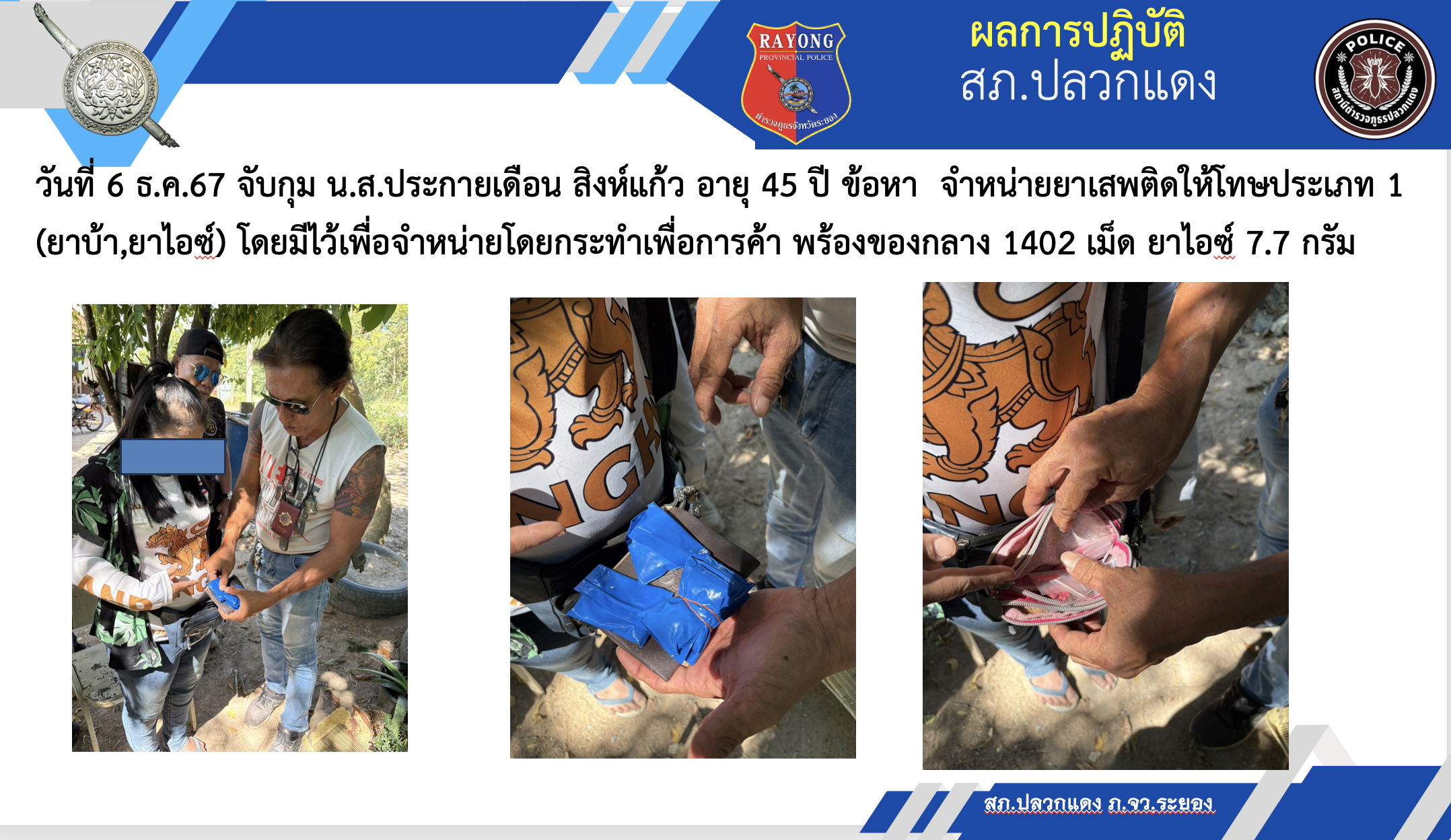 2567-พฤศจิกายน ผลการปฏิบัติงานป้องกันปราบปราม โดย สถานีตํารวจภูธร ปลวกแดง FacebookFacebookXXLINELine