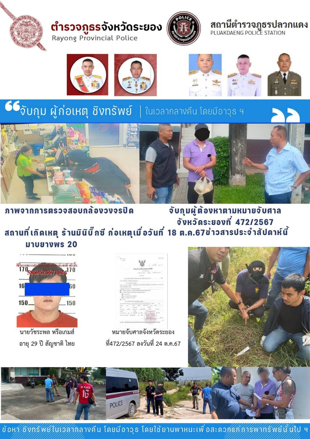 ตำรวจ สภ.ปลวกแดงจับกุมผู้ต้องหาตามหมายจับ วันที่ 11 ต.ค. 67ชุดสืบสวน สภ.ปลวกแดง ร่วมกับ ชุดสืบสวน สภ